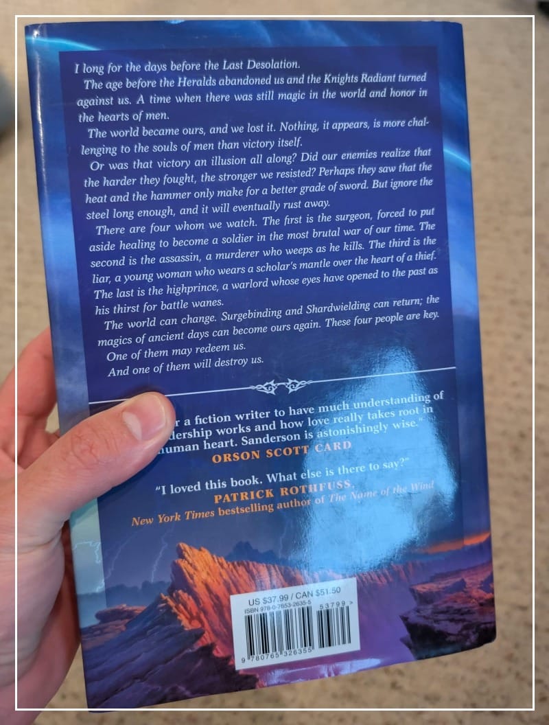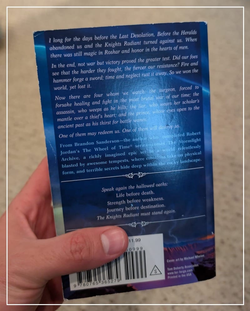 Today at work a coworker returned a copy of the paperback version of The Way of Kings I had let them borrow a few months back. In between meetings I was thumbing through the pages and found myself reading the blurb on the back cover, something I’ve actually never done since the majority of my reads and rereads of the Cosmere are in audio book form.