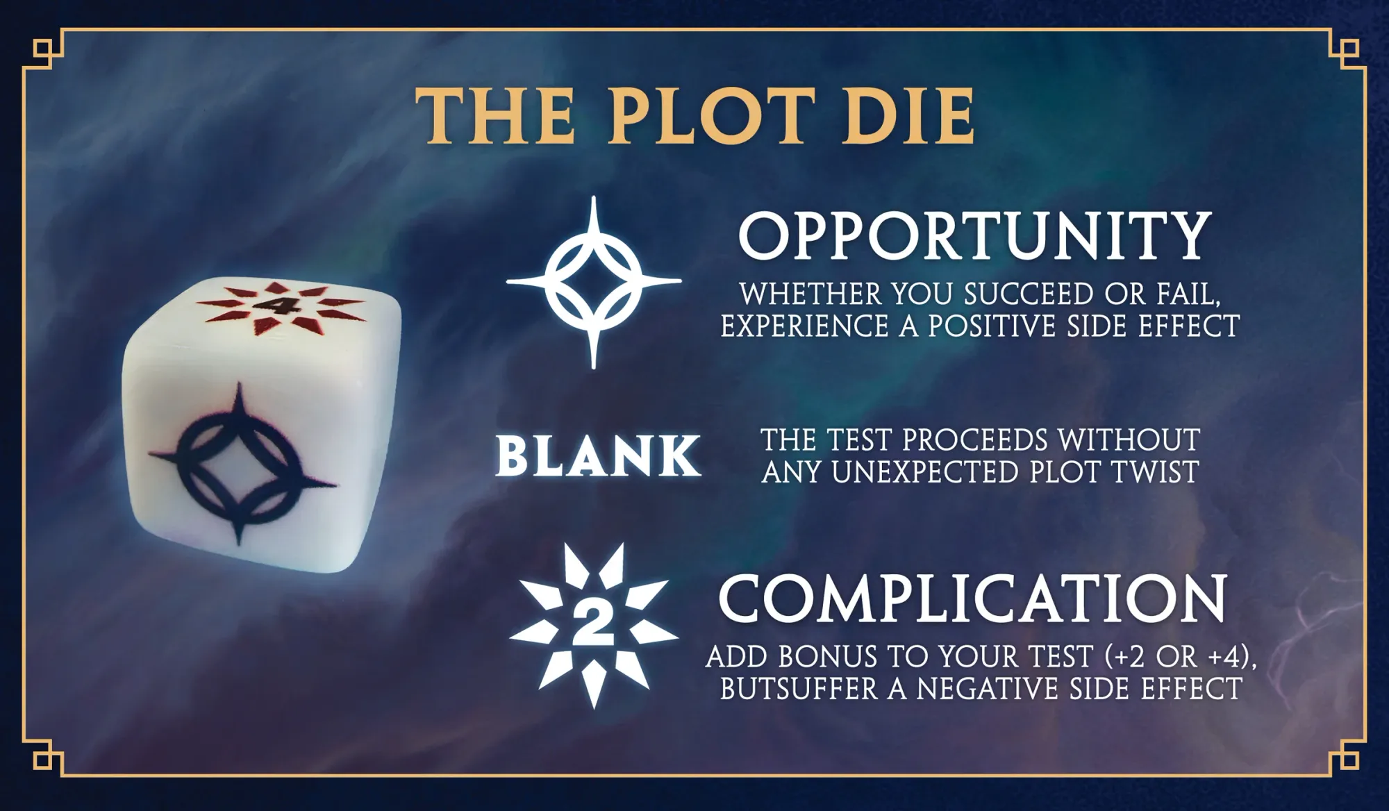 The die is used in conjunction with another skill test, and adds a modifier to the result of that roll. Landing on the opportunity symbol comes with a beneficial effect, not too dissimilar from a crit in 5th edition Dungeon and Dragons. Landing on a complication gives a negative effect, but comes with the consolation of a bonus to your roll, either a +2 or +4, depending on the face.