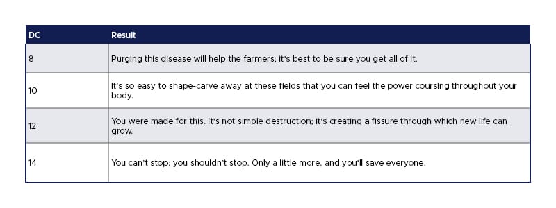 If they fail, they’ll lose control of themselves. Overcome with a surge of power and guided by the spren, they over-commit to the task and burn more of the field than needed. This is a failure only they realize; the farmers will understand that more of the crop was infected than anticipated. In this failure, the player may develop a deeper connection with their spren and a strong desire to learn to control their budding power.