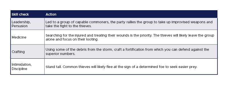 This is an opportunity for your group's potential Stoneward to take steps towards furthering their Radiant path. Their spren might point them towards a number of choices to help combat the thieves. Choose a scenario or two based on the skills of your party.