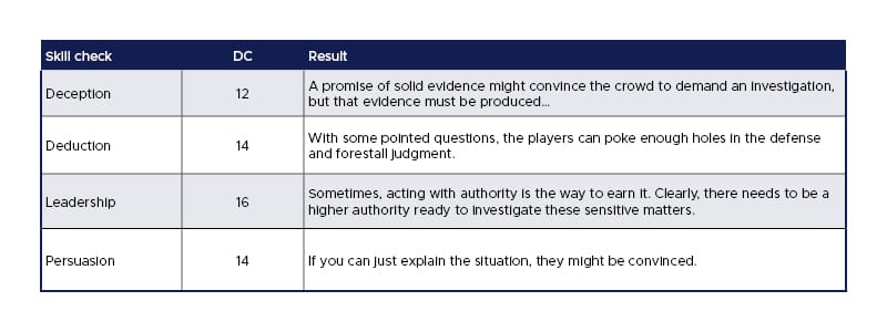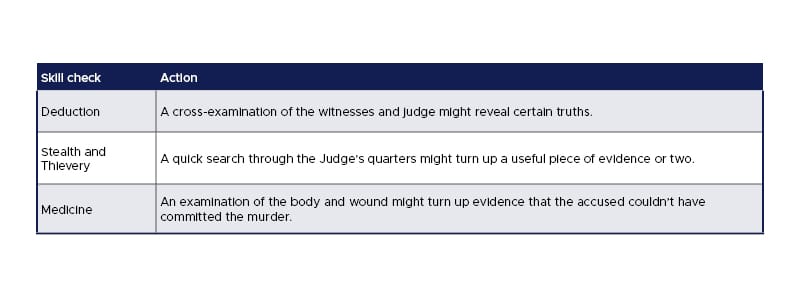 Give your party the means to find evidence against the judge. Don’t be afraid to allow skill checks and their own creativity to lay the path forward: maybe they go looking through the Judge’s quarters expecting to find the murder weapon… and there it is! Maybe a high Deduction roll gives them that crucial detail that unravels the whole case!