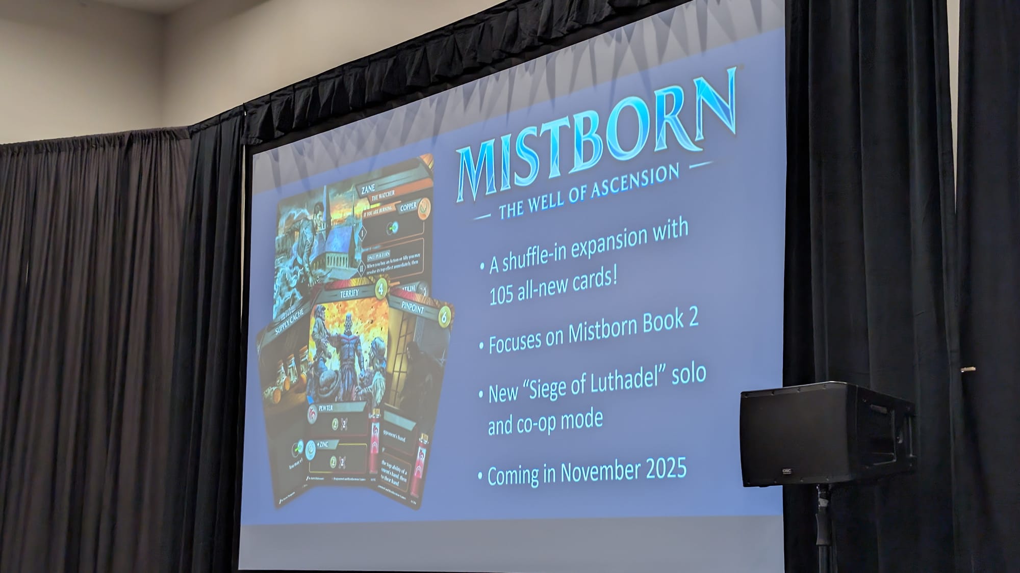We got some updates for Well of Ascension. This will be a "shuffle-in" expansion featuring over 100 new cards themed around book two of Mistborn: Well of Ascension. If you're not familiar with the term, it means that the new cards will be added in to the common pool of cards used to build players decks. It won't be a stand alone game, and will mix in with your existing deck.